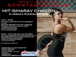 | 15:00 – 16:30h | Rumba Afrocubana Basic Bewegungen und übt die Körperkoordination, die man braucht um die Rumba zu tanzen. Für Frauen und Männer mit Salsa Grundkenntnissen. |